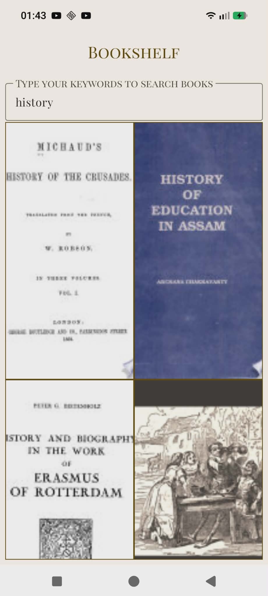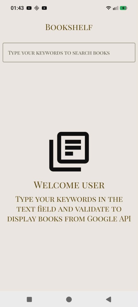 Displays its title, allows users to search for books, features dynamic UI interactions, and fully supports Material 3 with adaptive light and dark themes.