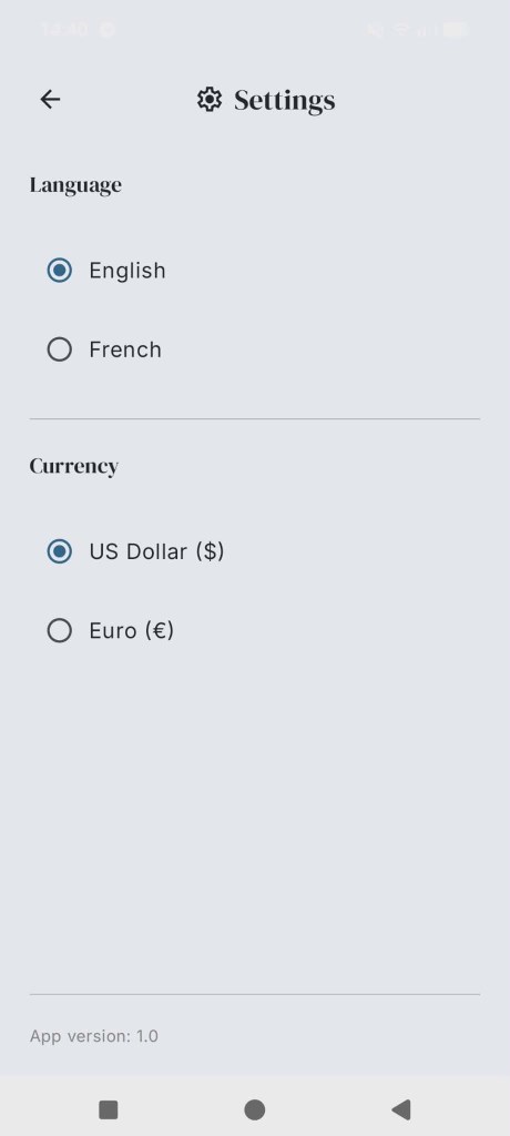 Language and currency can be changed dynamically, with real-time UI updates and automatic price conversion.