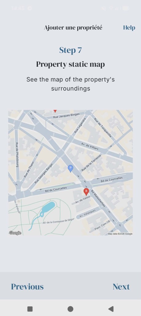 Maps properties, displays nearby listings as map pins, retrieves the user’s current location, and generates static map previews that are stored locally, remain available offline, and are restored after synchronization.